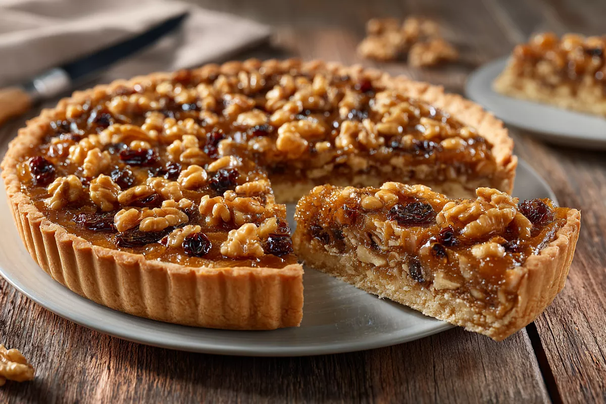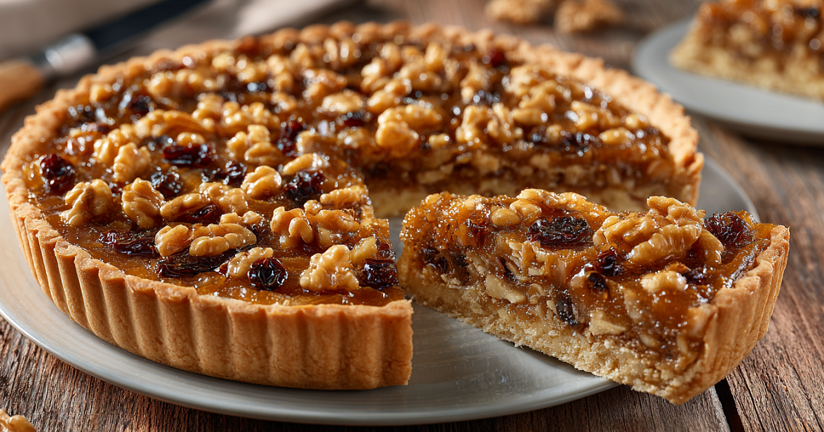 Хрупкое песочное тесто, грецкие орехи, изюм, курага и целая банка сгущёнки, которая превращается в густую молочную карамель.