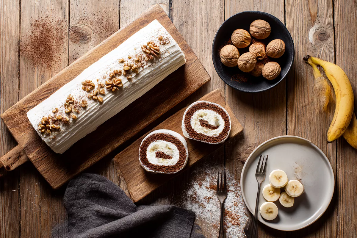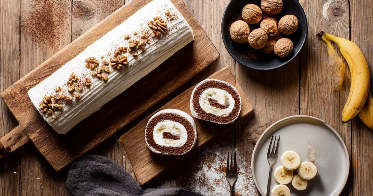 Мне особенно нравится, что такой рулет не требует особых кондитерских навыков. Нужно просто взбить яйца до хорошей пышности, аккуратно вмешать сухие ингредиенты и не забыть важный приём — свернуть корж сразу после выпечки, пока он горячий. Дальше остаётся только приготовить суфле на сливках с желатином, добавить бананы и орехи и дать рулету время настояться в холодильнике.