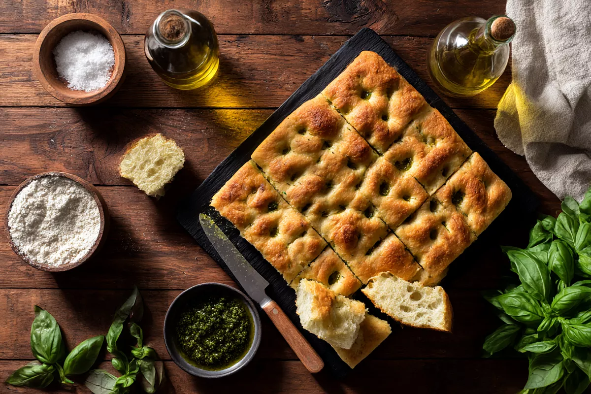 Сверху корочка получается хрустящей, а внутри — влажный, сочный мякиш. Больше всего мне нравится есть её с соусом песто, это очень по-итальянски и правда вкусно.