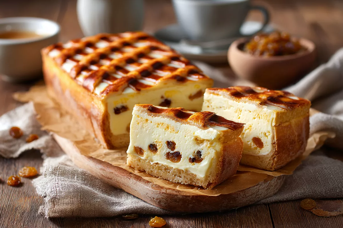 Достать форму с основой. Выложить всю творожную начинку и разровнять. Охлаждённый кусок теста раскатать в тонкий пласт толщиной 2 мм и нарезать полоски шириной около 1 см. Выложить полоски решёткой по диагонали сверху на начинку. Выпекать в заранее разогретой до 170 °C духовке 50 минут до красивого золотистого цвета.