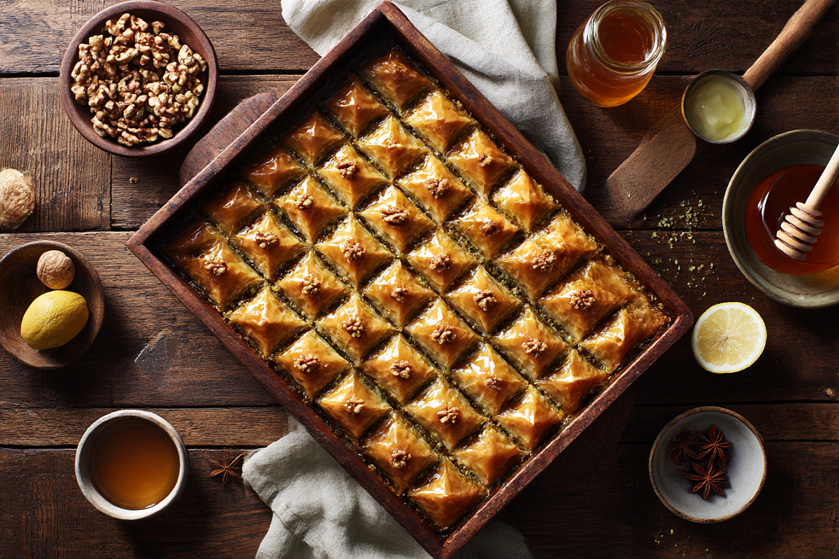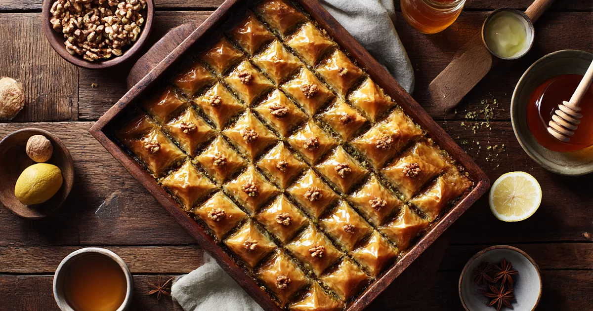 8 слоёв, грецкие орехи и пряный сироп с мёдом. Секрет — масло между слоями и «горячая пахлава + тёплый сироп»