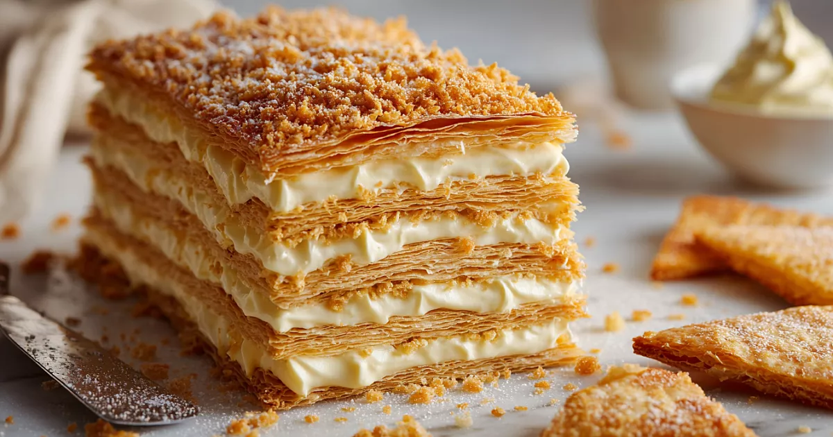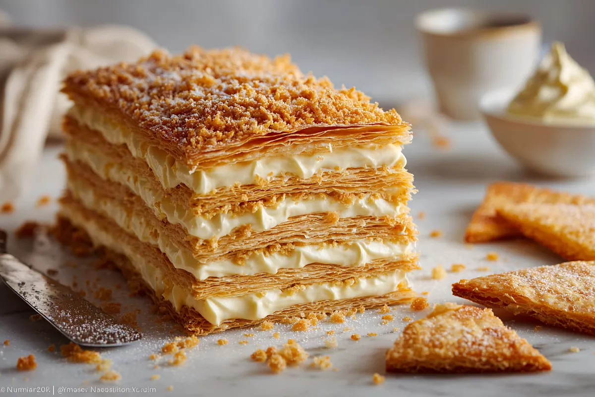 Берём 300 г готового бездрожжевого слоёного теста, размораживаем по инструкции и раскатываем чуть тоньше. Нарезаем на квадратики 10×10 см — получится 9 или 12 штук. Выкладываем на противень с пергаментом и выпекаем при 200 °C примерно 15 минут до красивого золотистого цвета. Остужаем до комнатной температуры — коржи становятся тонкими и невероятно хрустящими.
