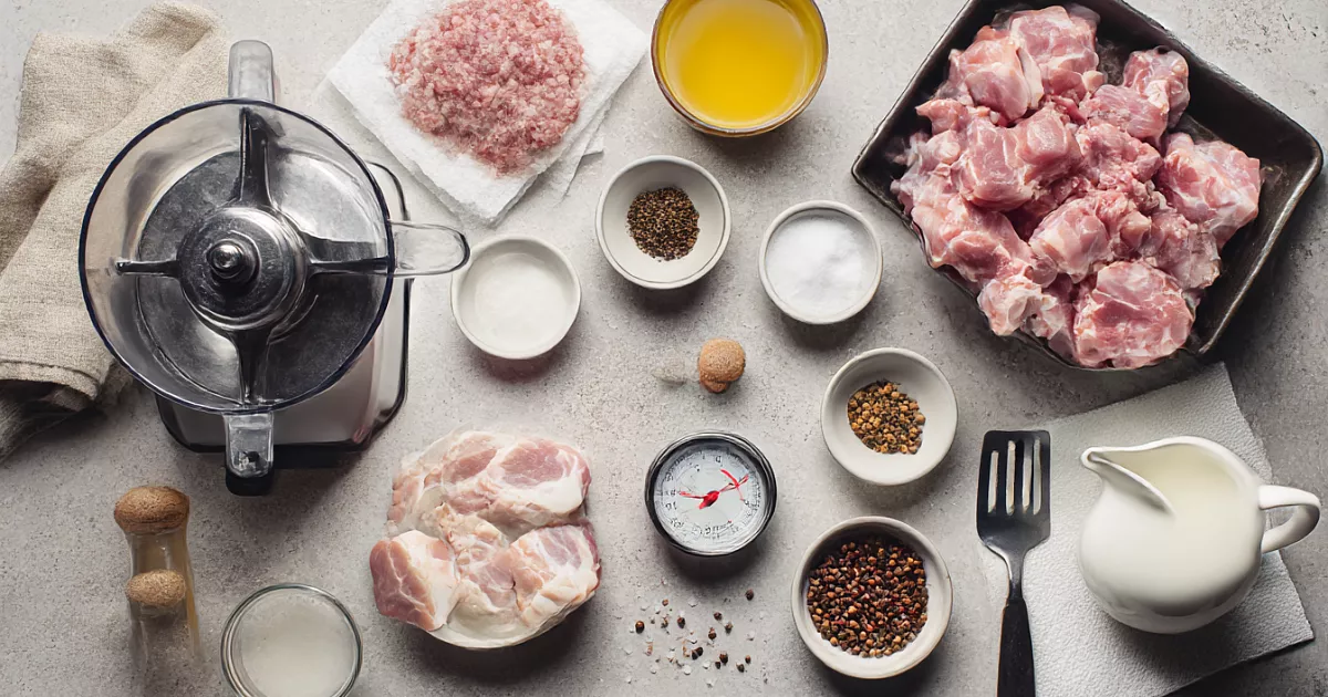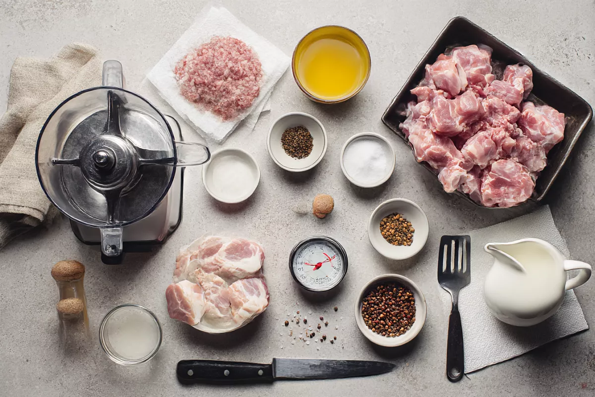 Для сочности нужна свинина, подойдет лопатка или окорок, а если хороших кусков нет, можно взять шею. Важно, чтобы сырьё оставалось холодным, желательно не выше 10 °C, поэтому мясо удобно брать слегка подмороженным. Такое мясо легче прокручивается на мясорубке со средней решёткой и даёт правильную структуру.