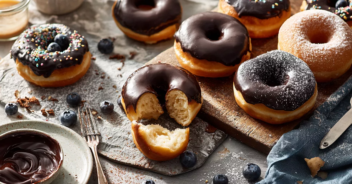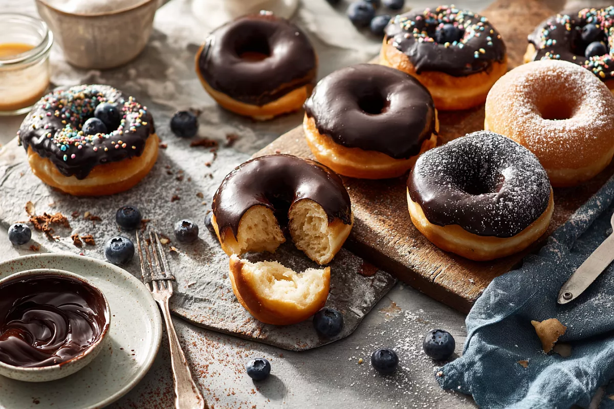Тёплые пончики окунаем самой пышной стороной в глазурь, даём стечь лишнему, сразу украшаем посыпкой и свежими ягодами. Даём глазури застыть 15–20 минут (можно в холодильнике).