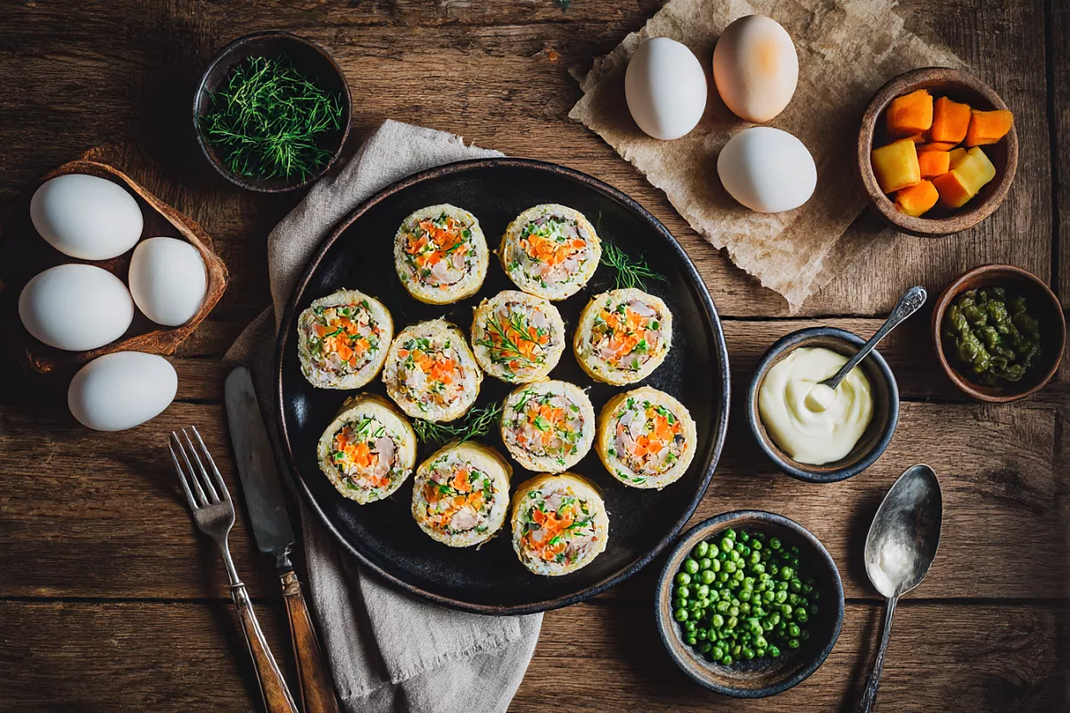 Знакомый вкус оливье, но в виде аккуратного рулета: выглядит как ресторанная закуска, а готовится дома без сложностей
