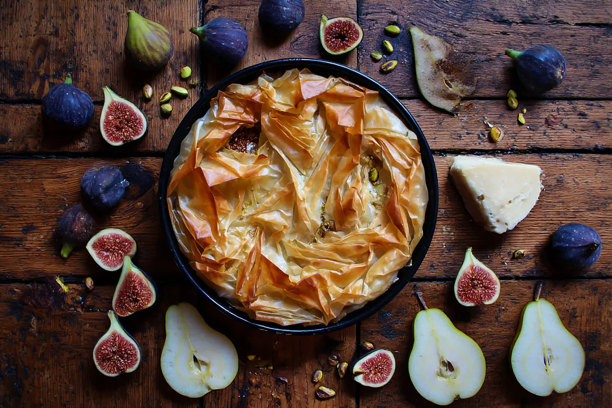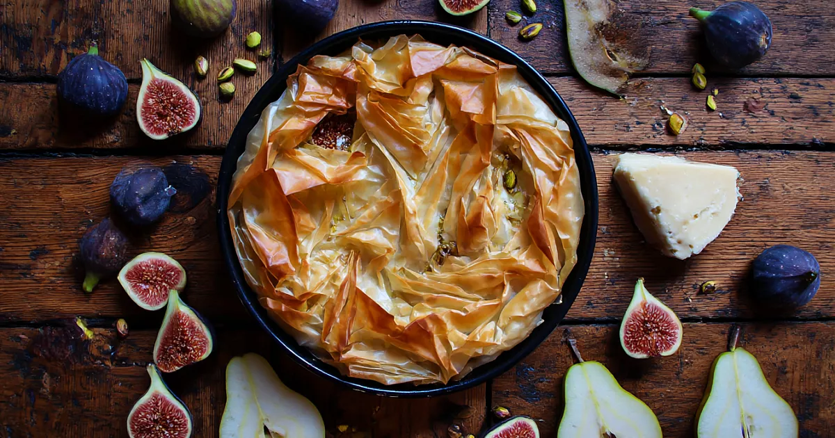 Порванные листы фило не выбрасывайте: из них удобно собирать центр и делать «розочку». А если хочется ещё богаче вкус, грушу можно заранее карамелизовать, но и без этого пирог получается выразительным и очень домашним.