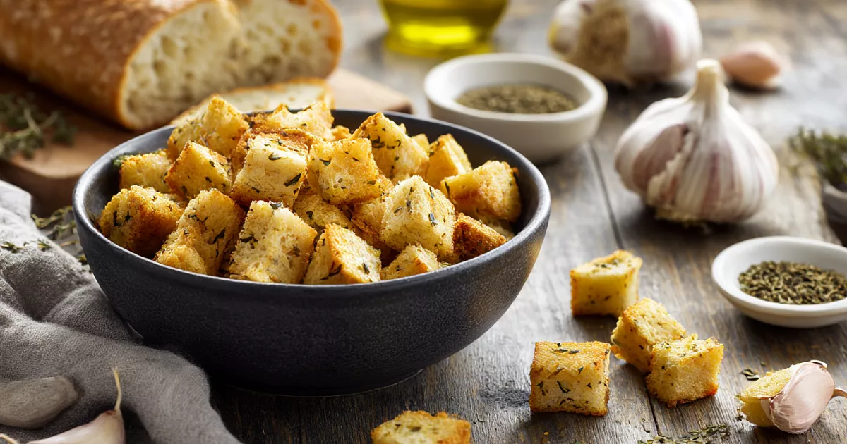 Сухарики можно сделать дома быстро и без «сюрпризов» в составе: багет, чесночное масло и щепотка трав — и готово.