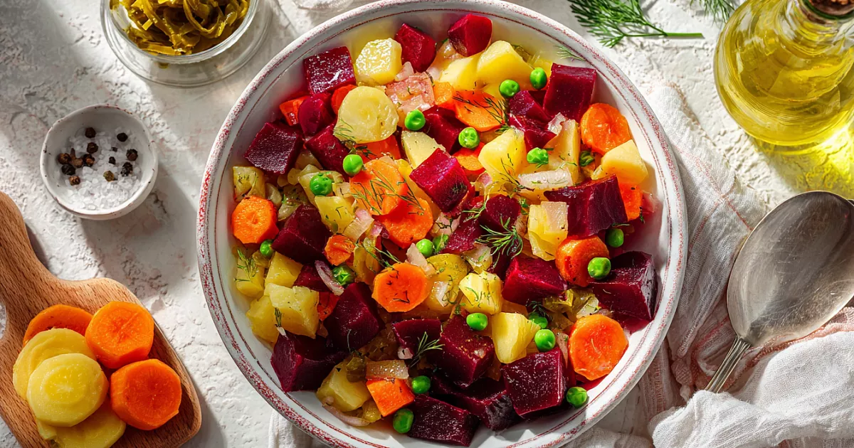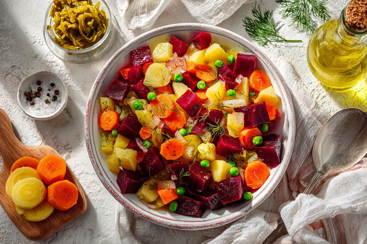 3 средние варёные свёклы режем кубиком в большую миску. Сразу заливаем 50 мл ароматного подсолнечного масла и хорошо перемешиваем — свёкла «запечатается», и остальные овощи не покрасятся в бордовый (хотя лёгкий розовый оттенок — это классика).