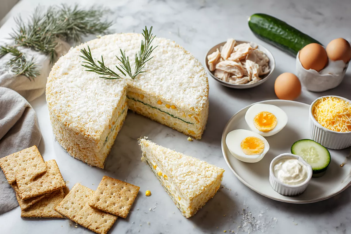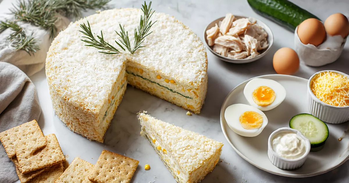Слоёный закусочный торт из крекеров с курицей, огурцом и сыром: собирается без плиты и пропитывается всего за час.