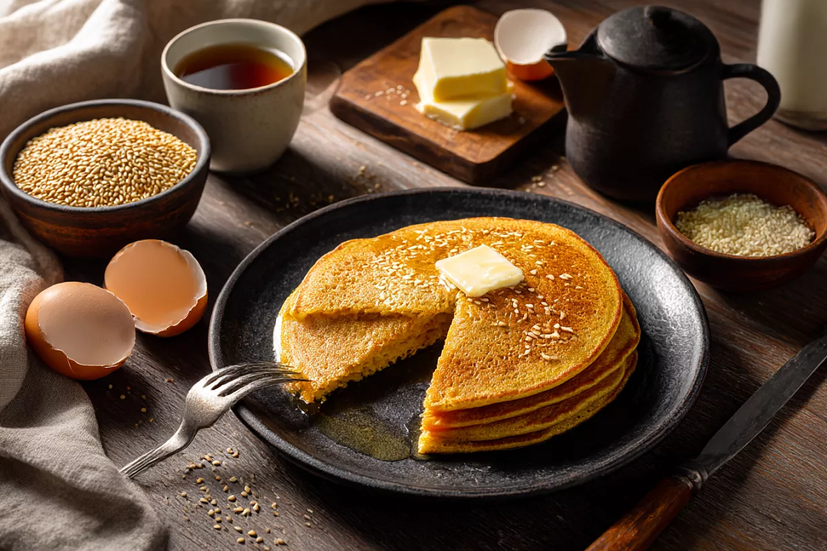 Шаг 5. Сразу посыпьте сверху кунжутом (по желанию). Жарьте на сильном огне до красивого «солнечного» оттенка, затем переверните. Можно переворачивать несколько раз: по минутке с каждой стороны, чтобы блин ровнее прожарился.