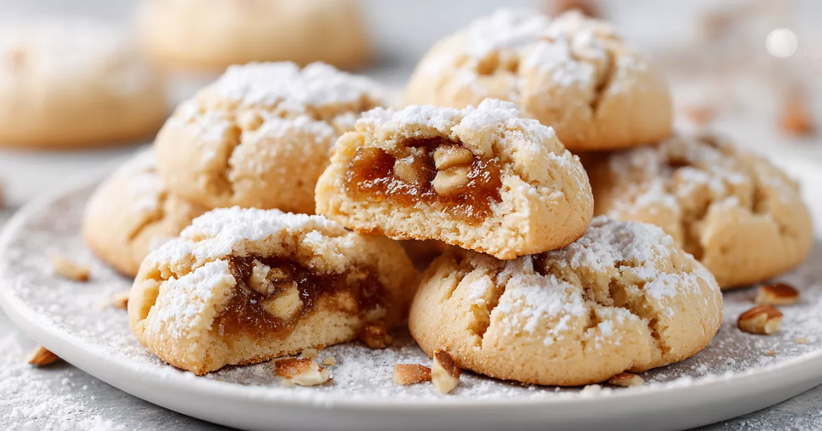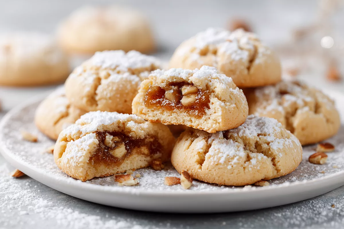 Хрустящее снаружи, мягкое и невероятно рассыпчатое внутри, с густой ароматной начинкой из яблочного варенья и орехов.