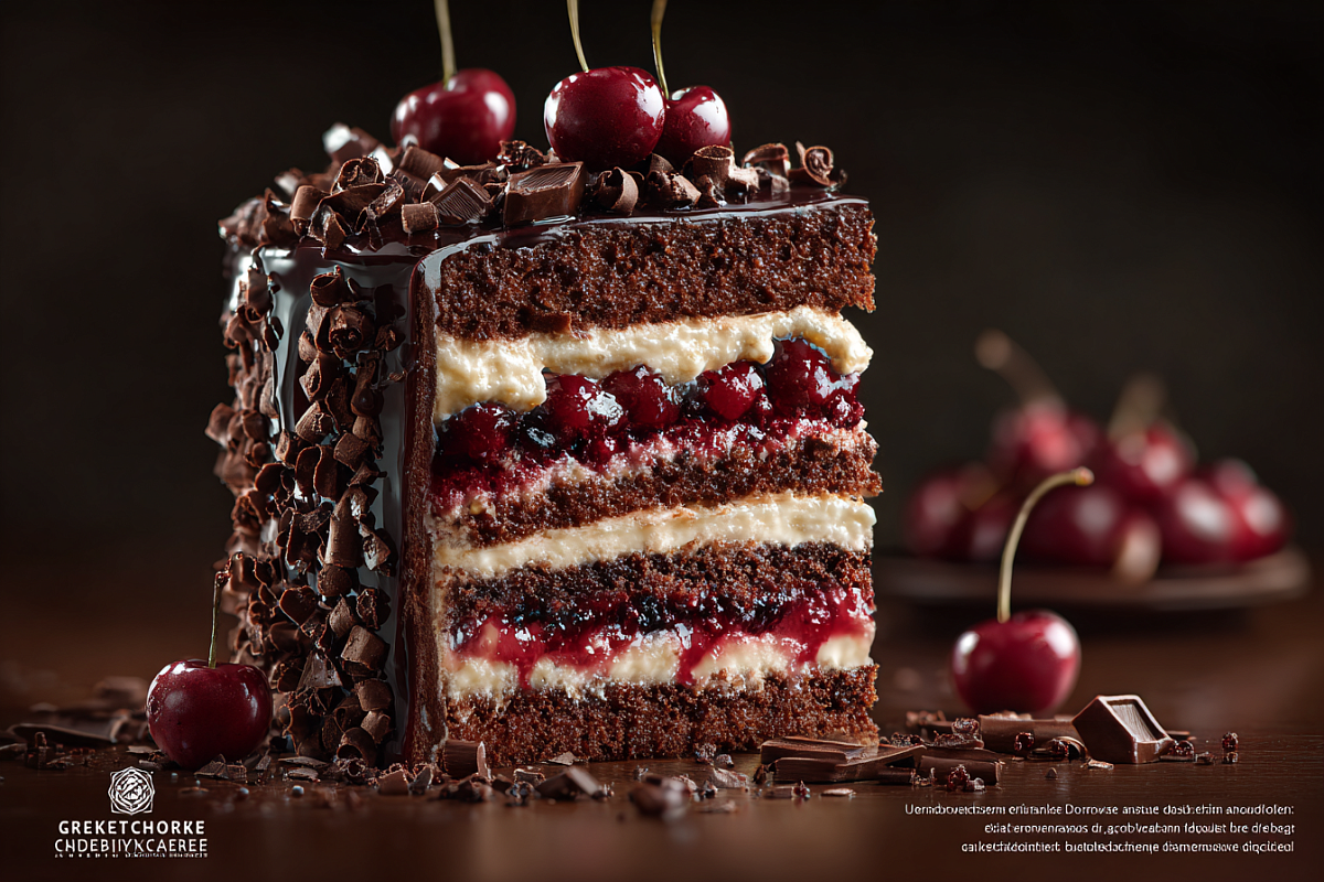 Нежнейший шоколадный бисквит, сочная кисло-сладкая вишня, фантастический карамельно-сливочно-шоколадный крем и гора тёртого шоколада сверху.