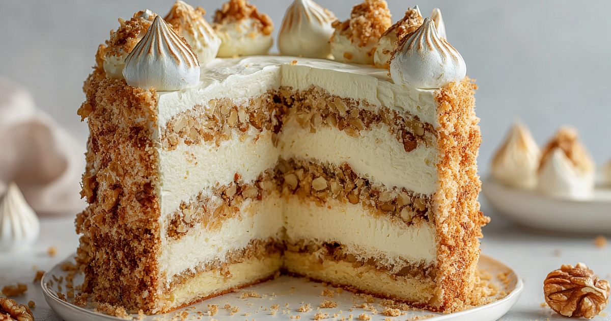 Два хрустящих ореховых безе, два тонких песочных коржа и море нежнейшего заварного крема на сливочном масле.
