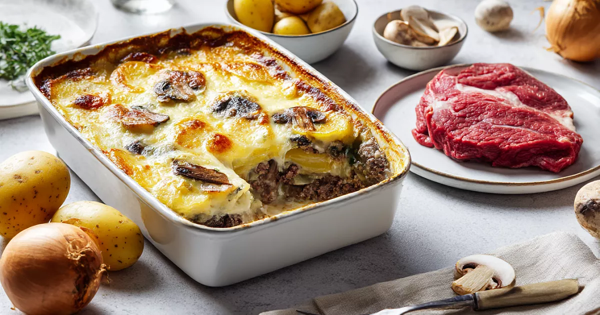 Запеканка «Орлов» когда-то выглядела по-французски строго: мясо, лук, грибы, картофель и базовый соус бешамель.