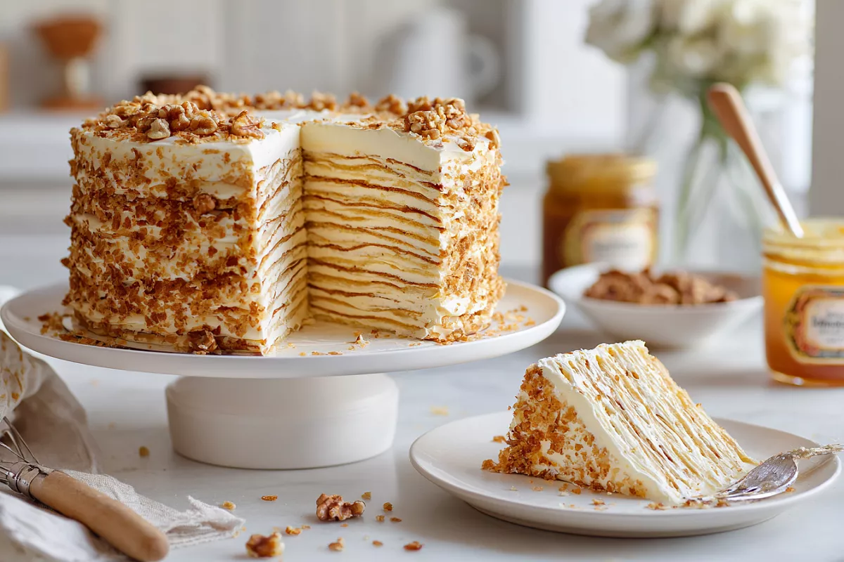 Этот торт — настоящая сенсация: тончайшие песочно-сметанные коржи, прослоенные воздушным ореховым безе и щедрым кремом из варёной и обычной сгущёнки.