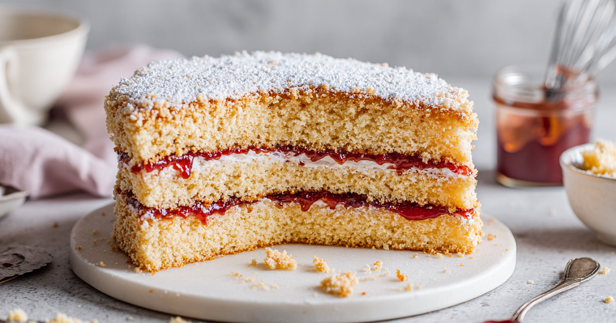 Верх и бока обильно смазываем оставшимся джемом. Обрезки коржа измельчаем в крошку и щедро обсыпаем весь торт — получается красиво и очень аппетитно.