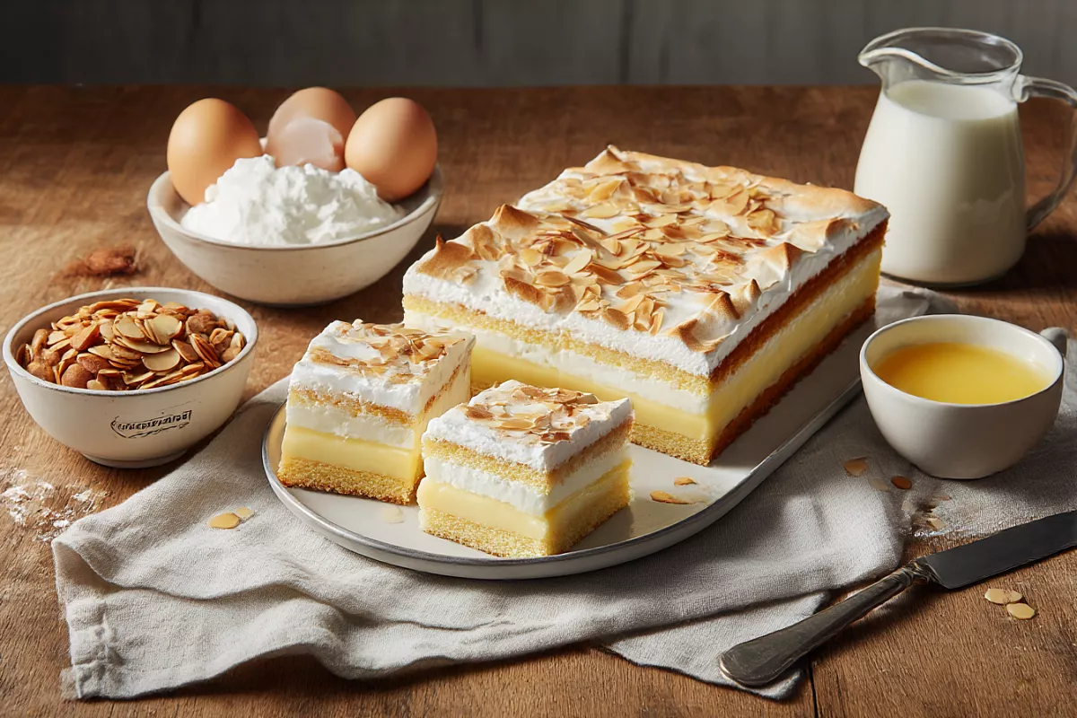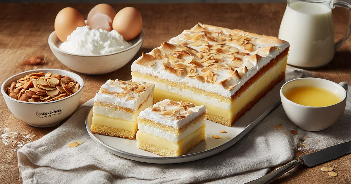 Противень 32×26 см застелите антипригарным пергаментом (при желании слегка смажьте). Выложите тесто и разровняйте. Сверху распределите меренгу, разровняйте и чайной ложкой сделайте рельефные «горы». Посыпьте сверху рубленым миндалём 100 г (можно заменить миндальными лепестками или грецкими орехами).