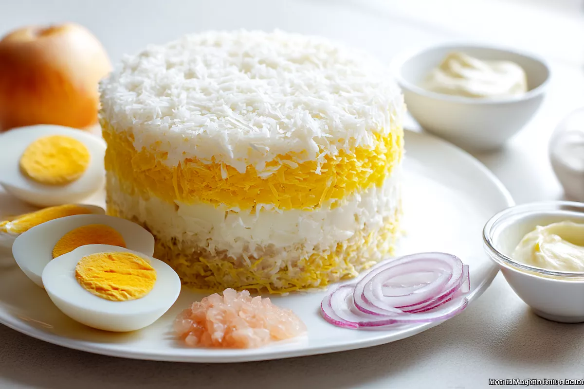 Лук обязательно хорошо отжимайте после маринада, а сырки подмораживайте заранее — так слои получаются аккуратными и салат выглядит по-праздничному.