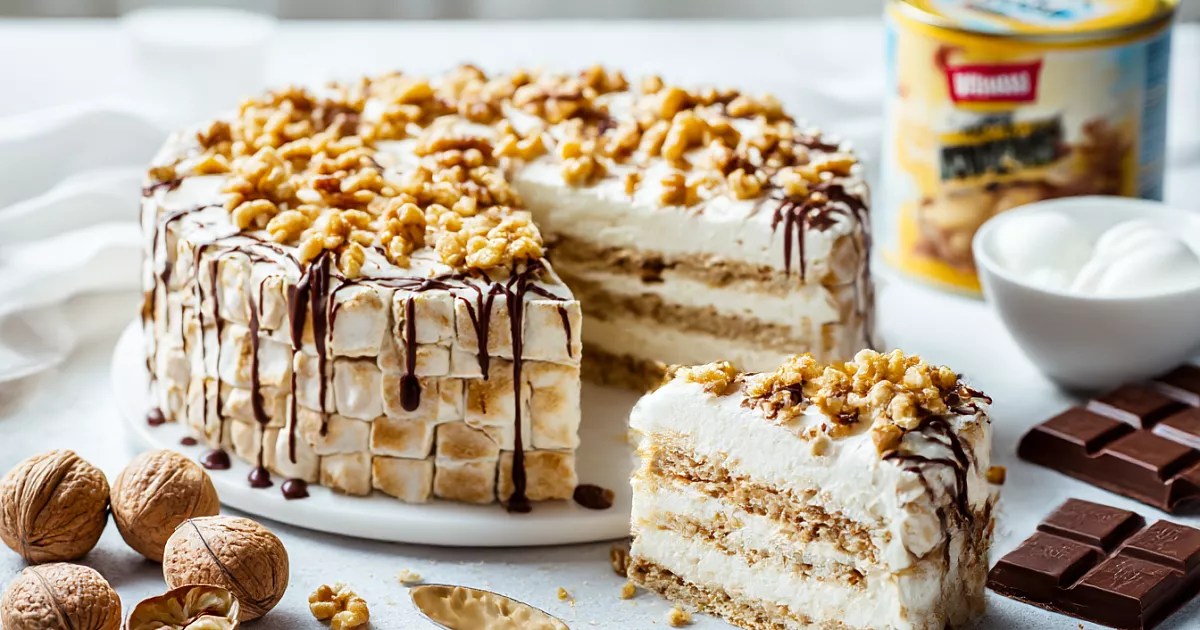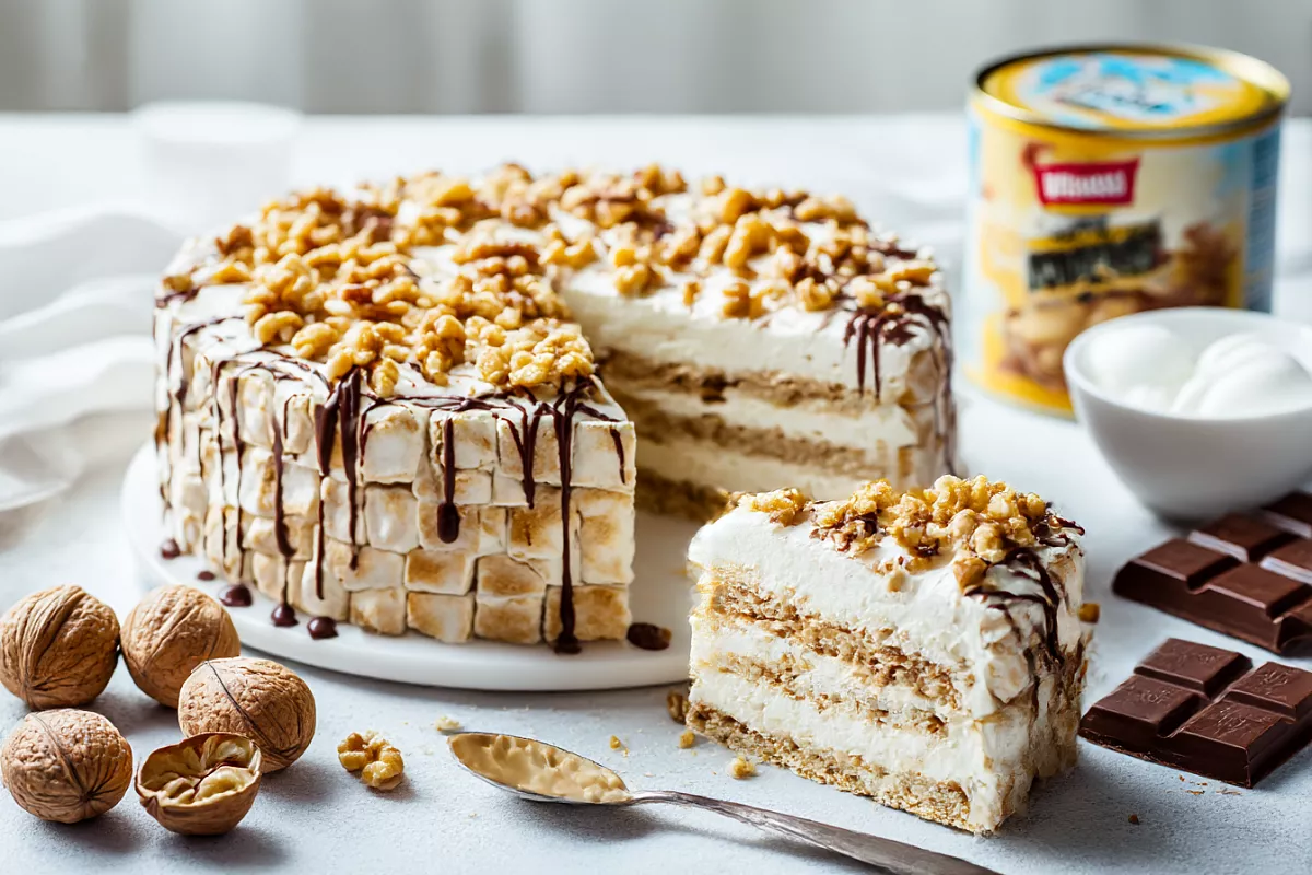 Собирайте торт так: выкладывайте меренги плотно друг к другу и промазывайте их кремом, формируя слой за слоем. Верх посыпьте рублеными орехами и крошкой меренги. Растопите кусочек шоколада и сделайте полоски.