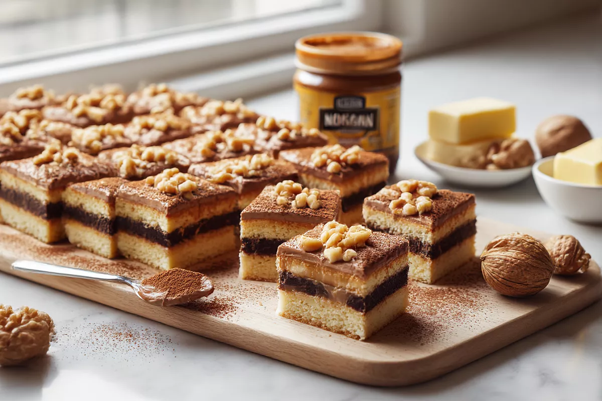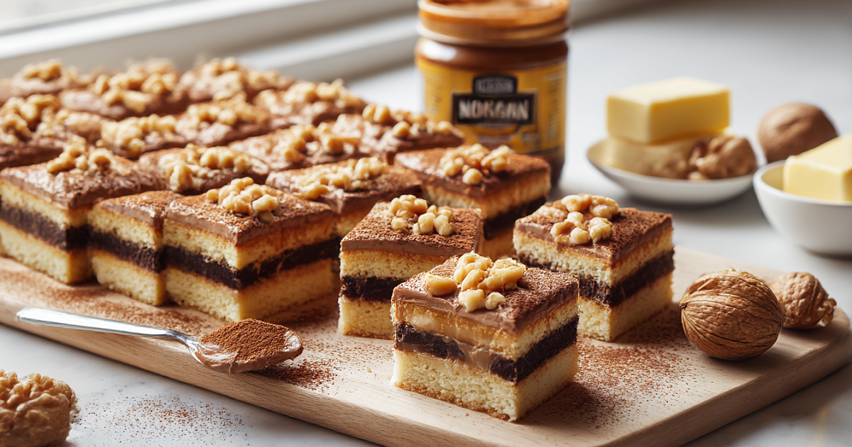 Коржи остудите. Крем разделите примерно пополам и обильно промажьте нижний и верхний корж. Для подачи посыпьте крупно порубленными грецкими орехами и слегка припылите какао. Такой торт мягкий сразу, но можно дать ему постоять около 2 часов.