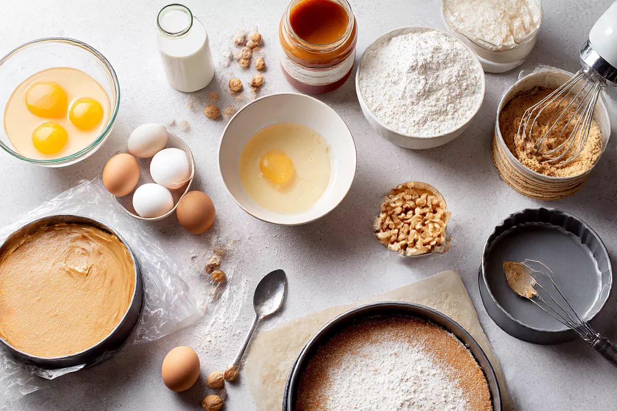 Разделите 3 яйца: белки отдельно, желтки отдельно. Духовку заранее разогрейте до 180 градусов. Муку соедините с разрыхлителем и сахаром, затем добавьте сливочное масло и перетрите руками до однородной крошки.