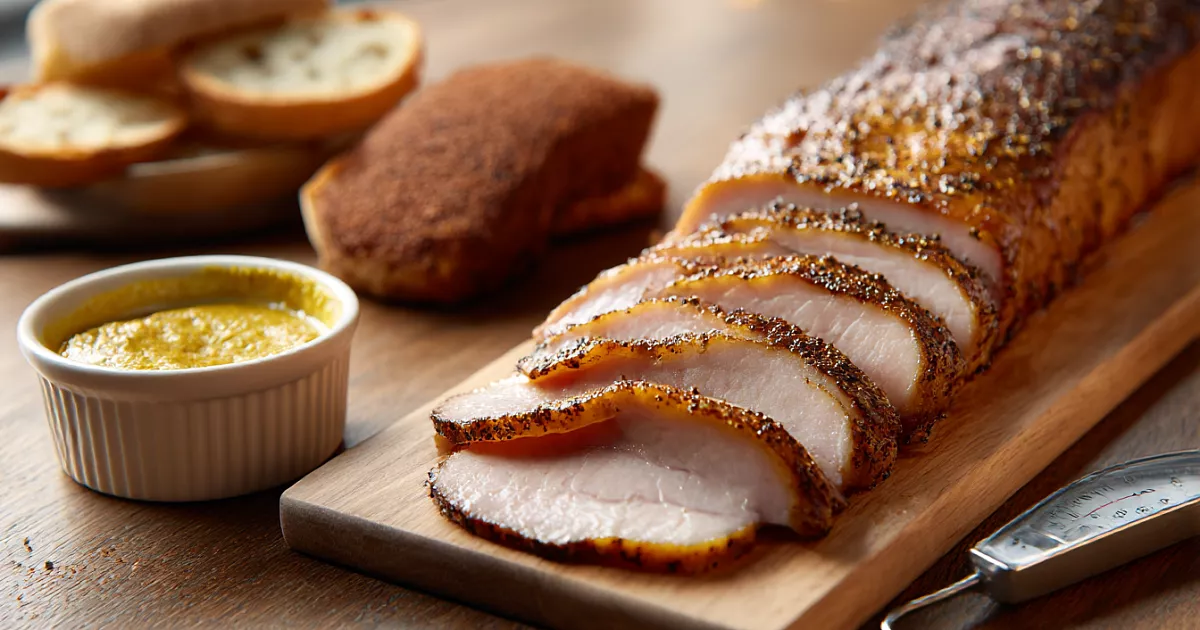 Термощуп вставляйте поперёк волокон, в середину куска: так при нарезке будет минимум «дырочек» на ломтиках. Запекайте до внутренней температуры 70–75 °C: около 70 °C — сочнее, 75 °C — если хотите перестраховаться. По времени для продолговатого не очень толстого куска в этом режиме получается примерно 2 часа до 70 °C, и около 2 часов 15 минут до 75 °C (ориентир — лучше контролировать термометром).