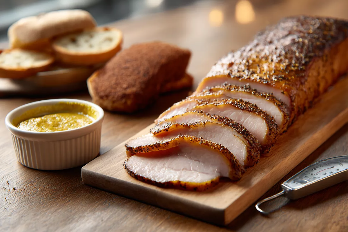 Для закуски карбонат обязательно полностью остудите и уберите в холодильник. Перед подачей режьте очень тонко, поперёк волокон. В бутербродах хорошо сочетается с горчицей и тонкими ломтиками хлеба.