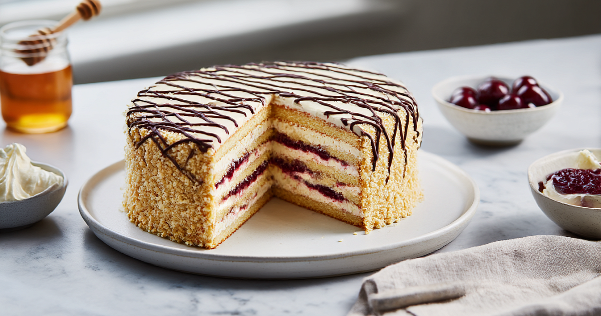 Если любите медовик, но не хотите возиться с раскаткой, этот вариант — находка: тонкие коржи из одного противня и сметанный крем с ягодной кислинкой.