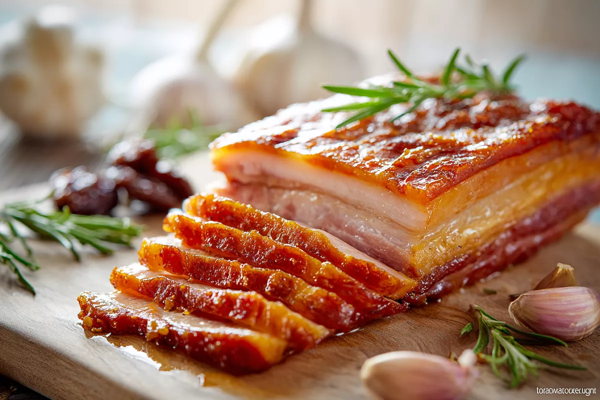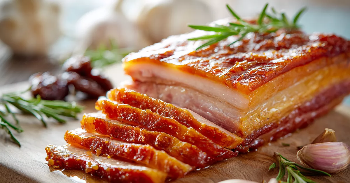 Кусок свиной грудинки ≈1 кг хорошо моем, обсушиваем и щедро натираем специями со всех сторон. На большой лист пергамента выкладываем грудинку. Сверху раскладываем пластинки чеснока (1 небольшую головку), 8–10 штук чернослива, веточку розмарина и горсть промытой луковой шелухи — она даёт красивый цвет и лёгкий копчёный оттенок.