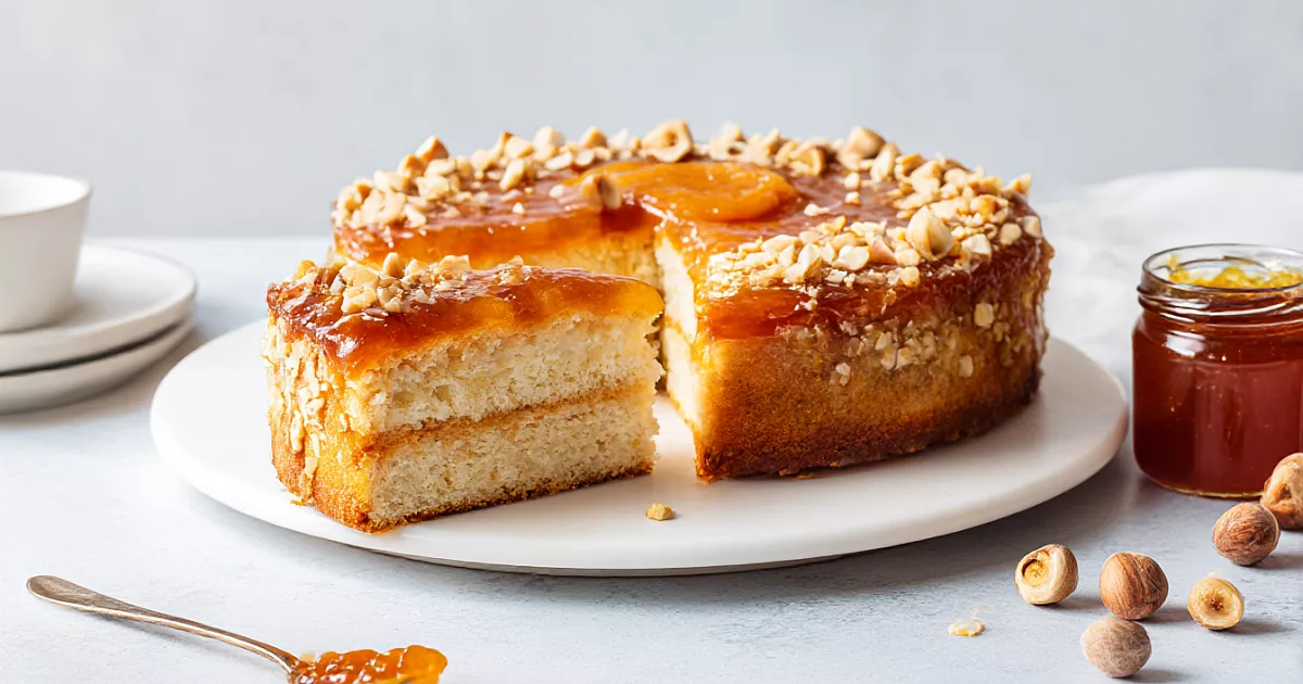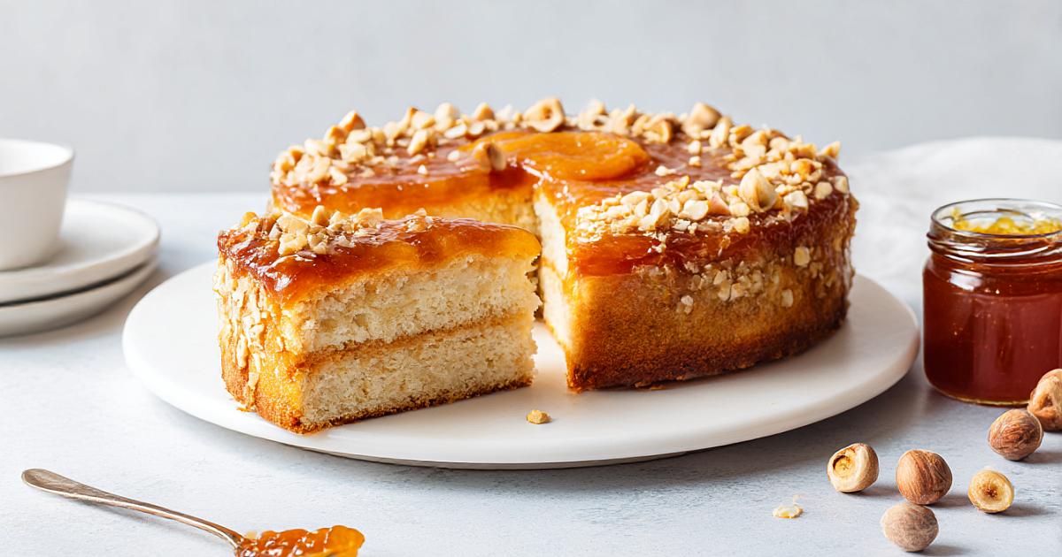 Горячий пирог достаньте из формы и прямо горячим смажьте сверху тем же повидлом. Затем посыпьте орехами по вкусу. Дайте полностью остыть, нарежьте и подавайте к чаю — в разрезе будут аккуратные слои.