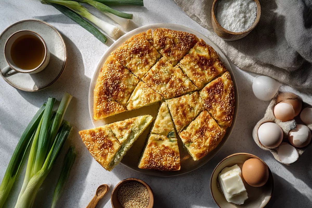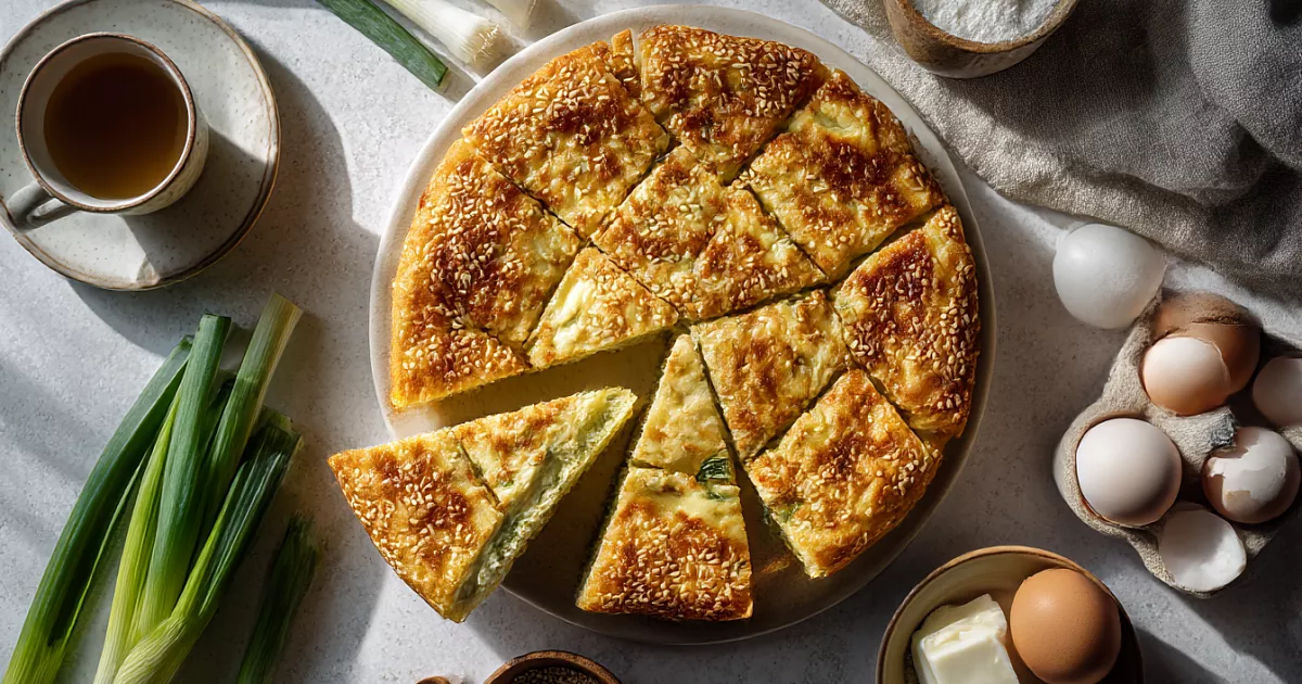 Форму смажьте растительным маслом. Вылейте половину теста, сверху разложите начинку и залейте второй половиной теста. Присыпьте кунжутом.
