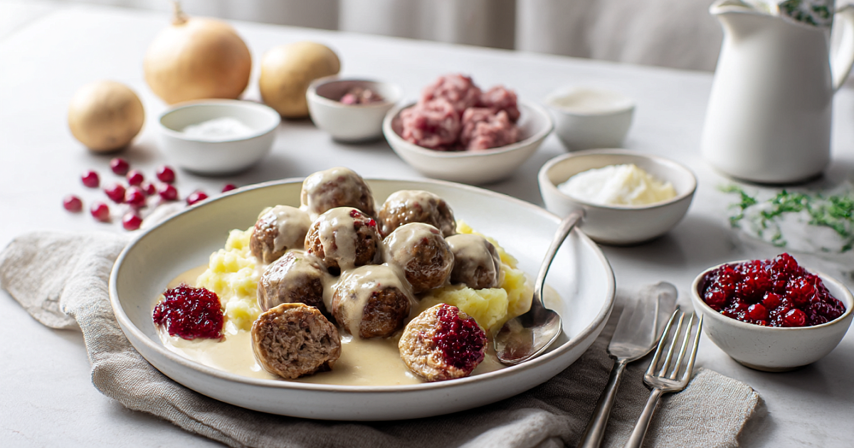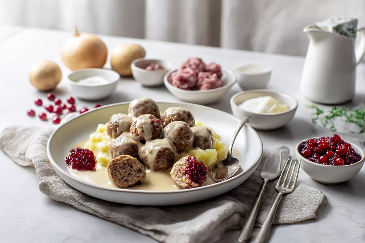 Нежные маленькие фрикадельки, сливочный соус и сладко-кислый джем — сочетание простое, но очень праздничное.