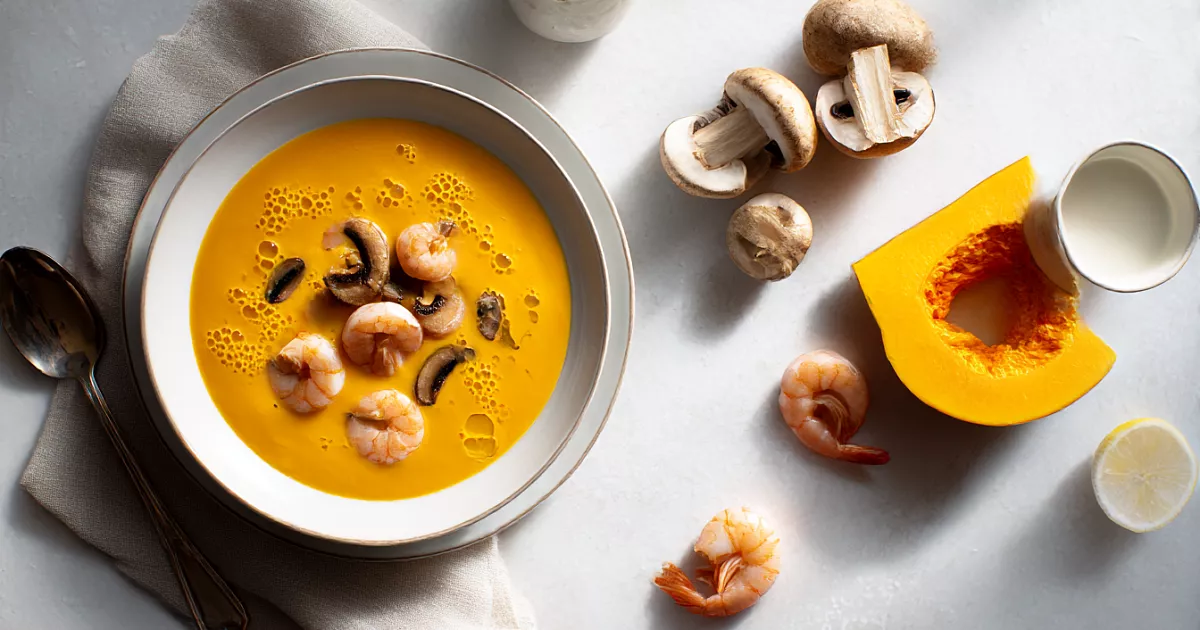 Тыква даёт мягкую сладость, морковь поддерживает цвет и делает вкус ровнее. А том-ям — это острая тайская паста — добавляет характер, но важно класть её частями, чтобы не переострить.