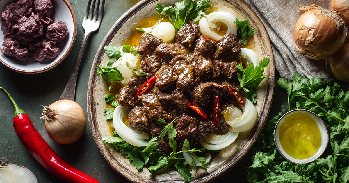 Подавайте слоями: на дно тарелки — слой лука и кинзы, сверху — горячее мясо и обязательно полейте его горячим маслом, которое осталось в сковороде. Затем добавьте ещё слой лука, кинзы и крупно нарезанный острый перец.