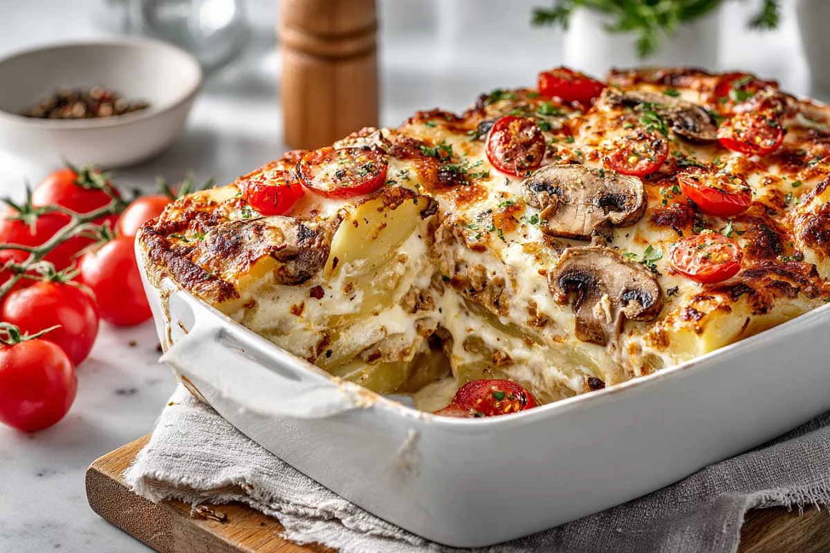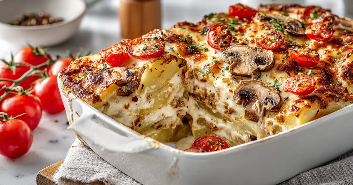 Сочная курица, нежные шампиньоны, томатная свежесть и золотая сырная корочка — гости просят добавки и рецепт одновременно.