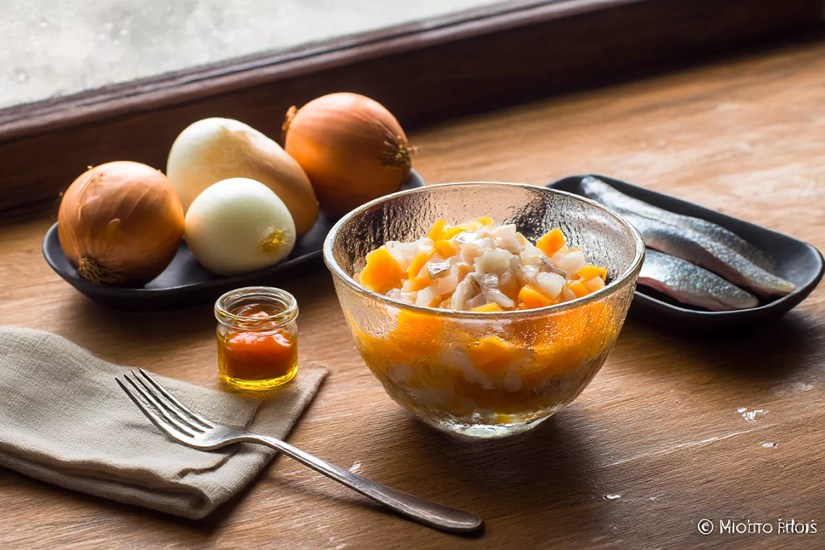 Возьмите одну среднюю селёдку. Срежьте голову и хвост. Аккуратно достаньте из брюшка молоки или икру, если они есть. Затем снимите шкуру с двух сторон, отделите филе от костей и нарежьте его небольшими кусочками.