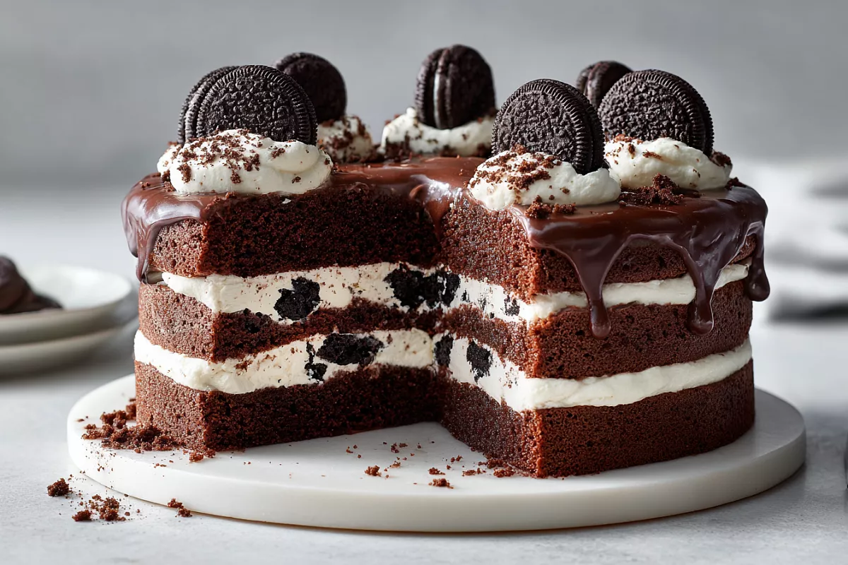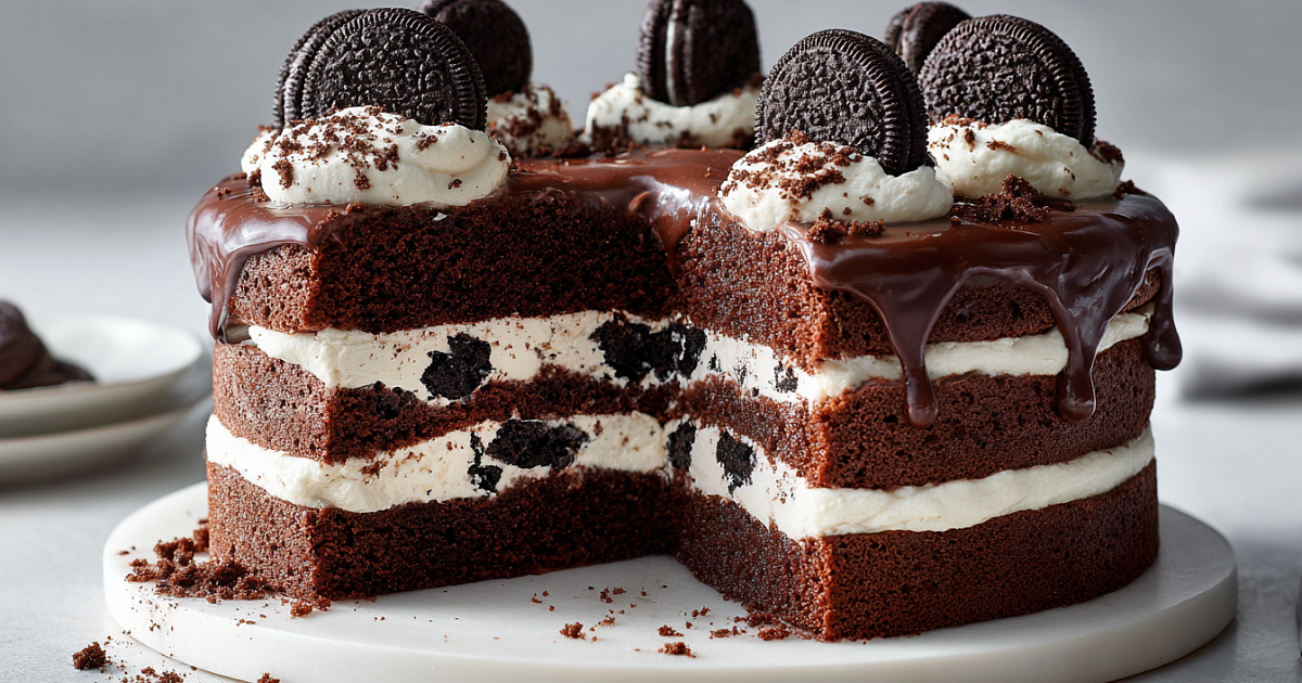 3 коржа слегка подравниваем по высоте. Собираем торт: корж, щедрый слой крема, корж, крем, корж, крем, последний корж. Обмазываем бока и верх оставшимся кремом. Готовим помадку: 80 г чёрного шоколада, 80 мл горячих сливок (20%+) и 10 г масла — размешиваем до гладкости. Покрываем торт помадкой, украшаем печеньями, крошкой и посыпкой. Убираем в холодильник на 5–6 часов — торт пропитается и станет ещё нежнее.