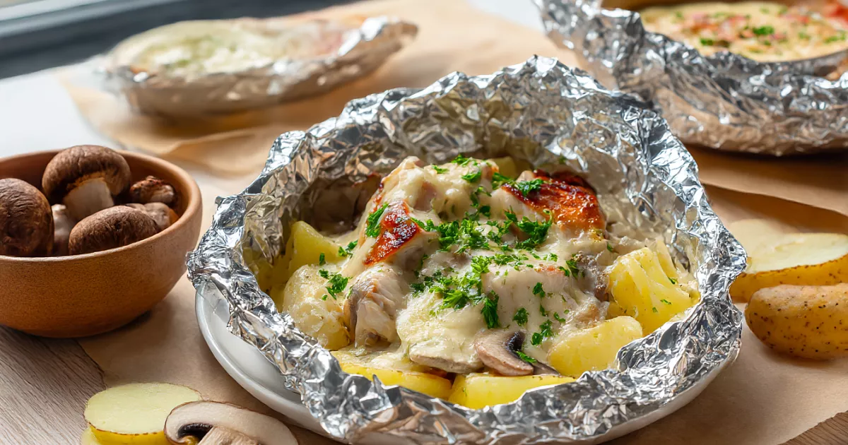 За 40 минут до подачи разогрейте духовку до 160 °C. Поставьте порции на противень (удобно — на верхний уровень, чтобы пакеты свободно помещались по высоте) и запекайте около 40 минут. Подавайте прямо в «конверте»: аккуратно разверните фольгу и пергамент — внутри будет сочная курица и готовый гарнир.