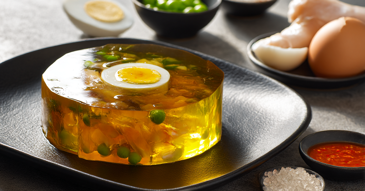 Курица и кальмар звучат смело, но в заливном они будто усиливают вкус друг друга. Получается прозрачное желе и очень мягкая начинка.