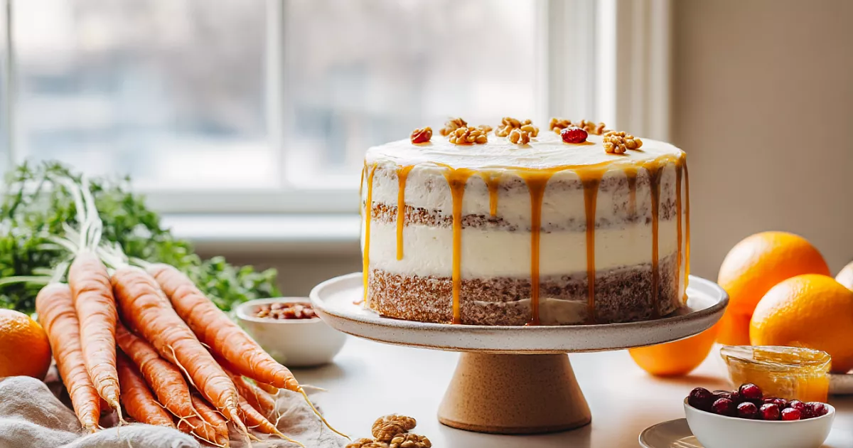 Пряный морковный торт с клюквой, апельсиновой карамелью и сырным кремом получается очень сочным, насыщенным и идеально подходит к чаю.