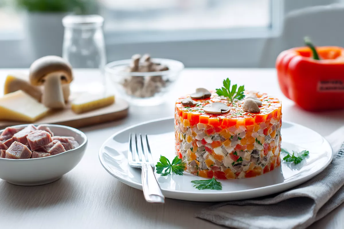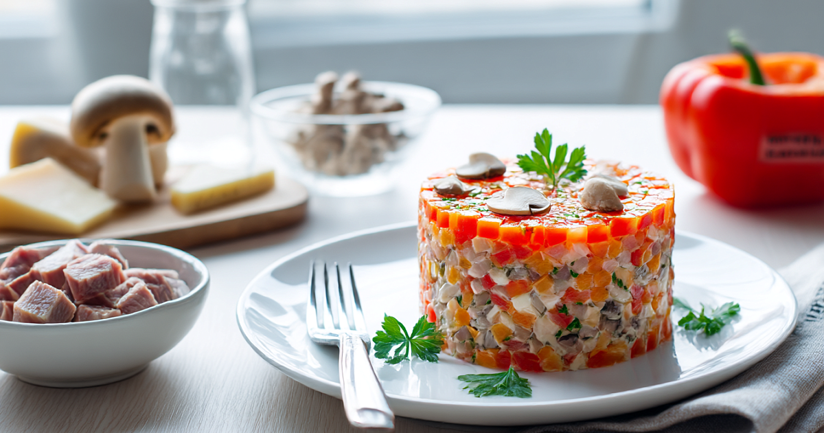 Этот салат не про «купить, нарезать и смешать». Вкус держится на двух вещах: сочном отварном мясе и действительно хороших маринованных грибах. Мясо лучше варить со специями, луковицей и морковкой, а потом остужать прямо в бульоне — так оно остаётся нежным и не сухим.
