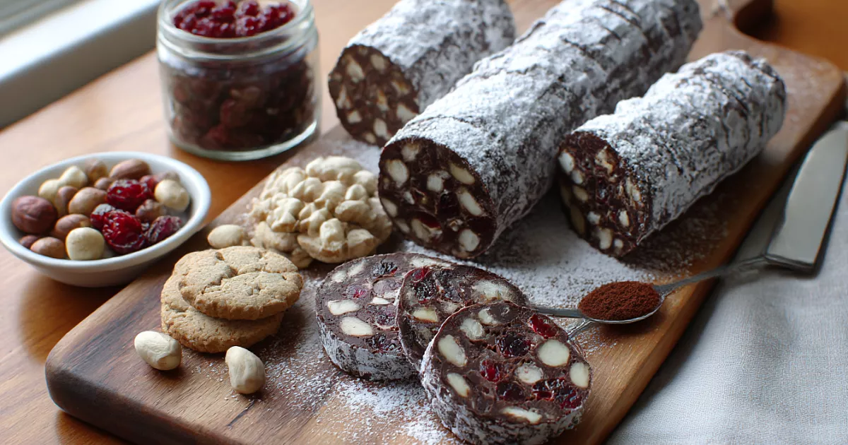 Помню, как в советские времена эту «колбасу» любили дети. По легенде ее делали из кондитерских обрезков, а теперь мы с удовольствием готовим её дома — получается нежная, в меру сладкая и с приятными сюрпризами внутри.