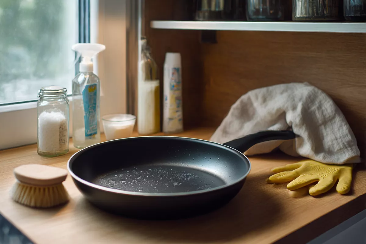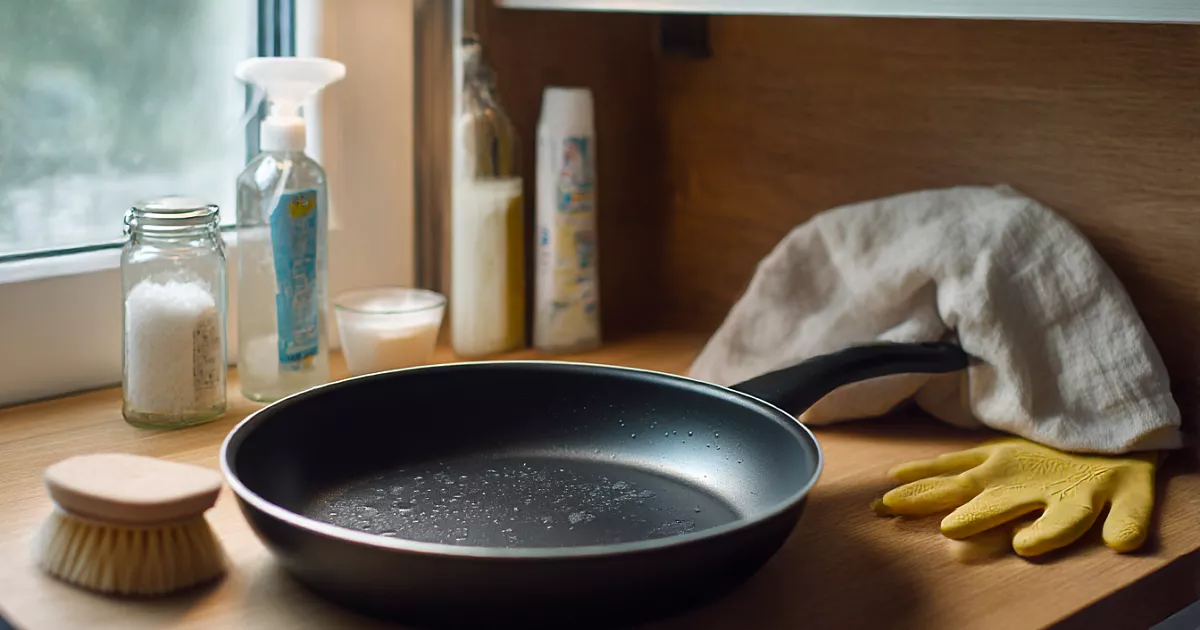 Если нагар на современной антипригарной сковороде не отмывается простым моющим средством, попробуйте этот мягкий метод с нашатырём — минимум усилий, и посуда как новая.