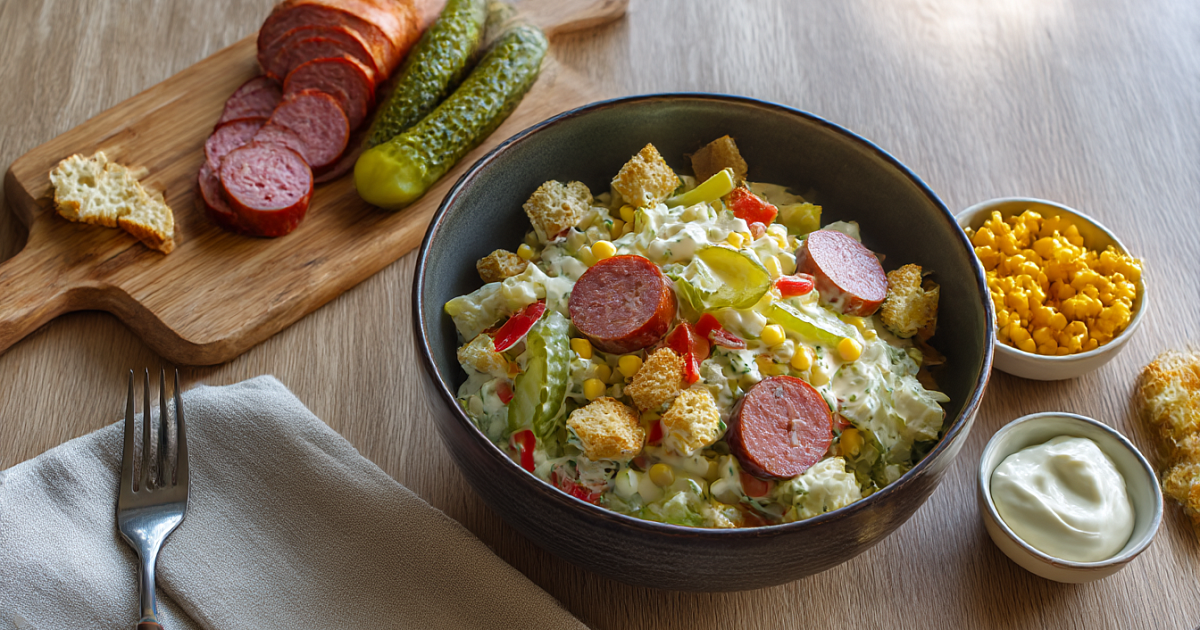 Когда хочется чего-то простого, сытного и с ярким вкусом, этот салат из подкопчённой колбасы и бочковых огурчиков выручает всегда — готовится за считанные минуты и исчезает со стола первым делом.