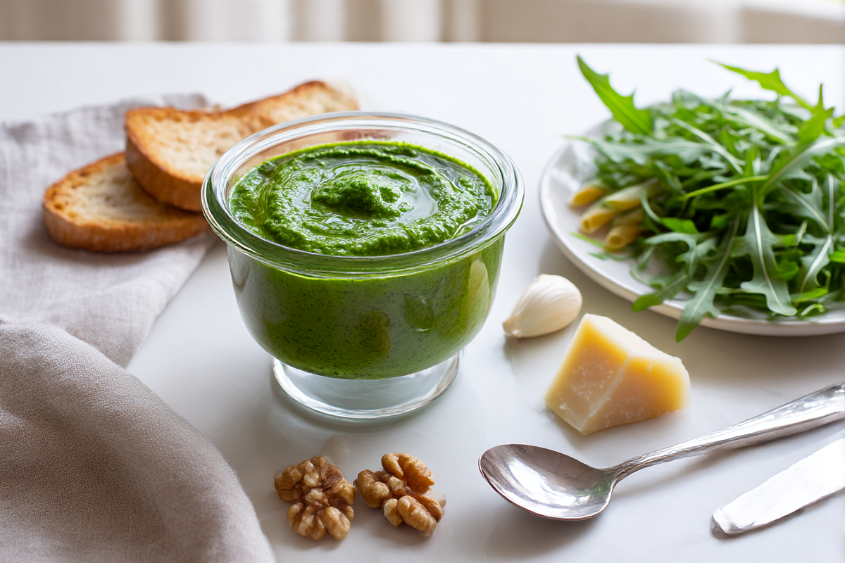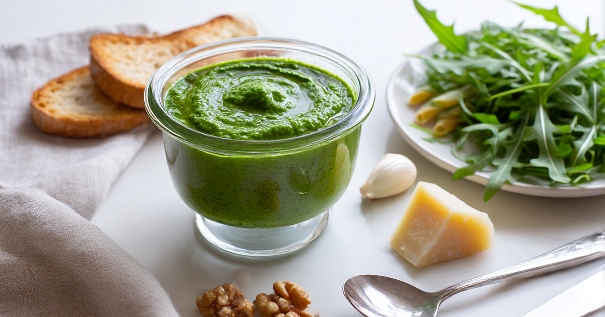 Всего одна пачка обычной рукколы из ближайшего магазина — и через минуту у вас готов яркий, пряный соус, который можно мазать на хлеб, добавлять в макароны или подавать к мясу.