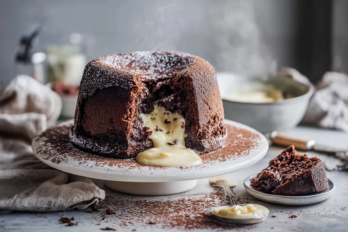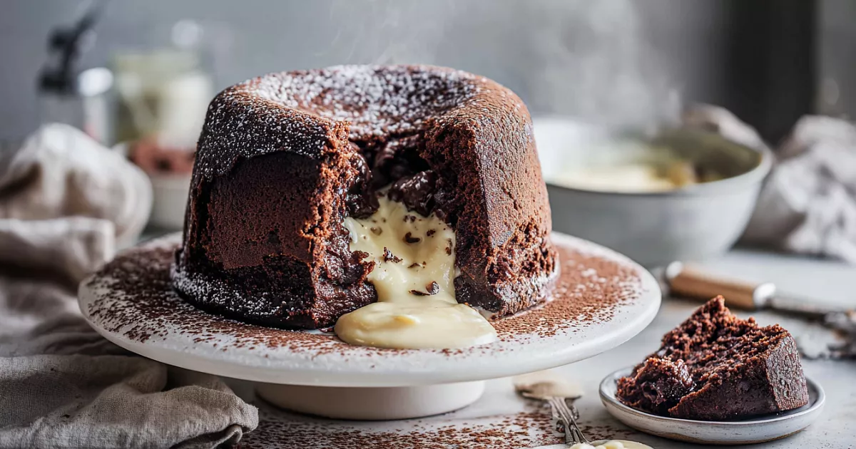 Шоколадный бисквит снаружи, а внутри горячий нежный крем, который вытекает при разрезе. Гости ахают, а готовится проще простого.