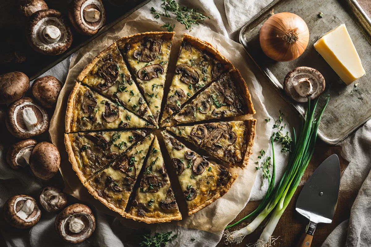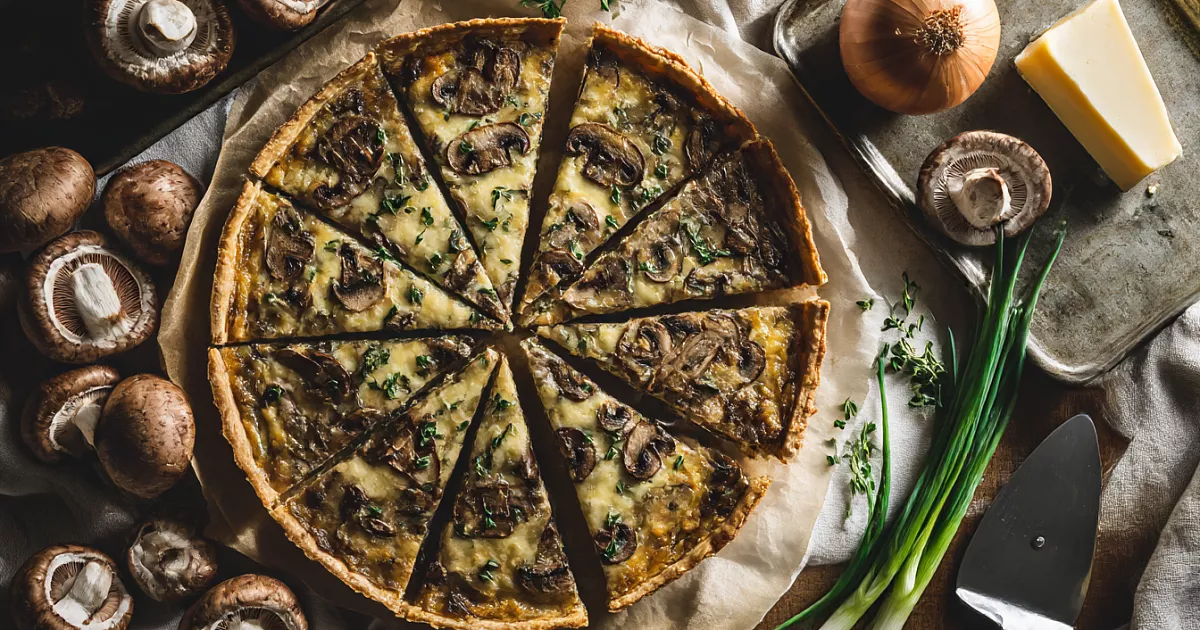 Готовый пирог посыпаю укропом и нарезаю на 8 кусочков. Он правда напоминает пиццу, но по структуре это именно пирог — тонкий, хрустящий, с сочной грибной начинкой.