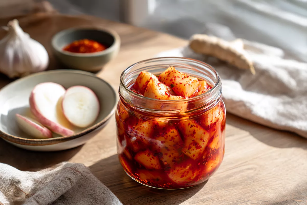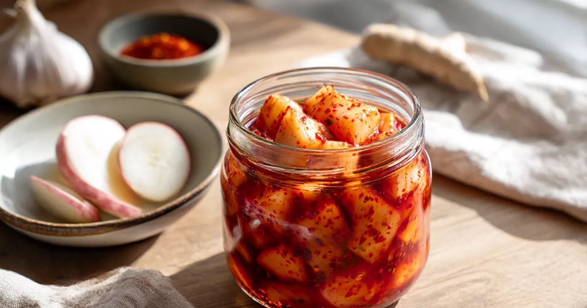 Делюсь своей любимой закуской из редьки по мотивам корейского кимчи — делаю её постоянно, и все домашние требуют ещё. Остроту регулирую сама, чтобы не жгло, а просто будоражило.