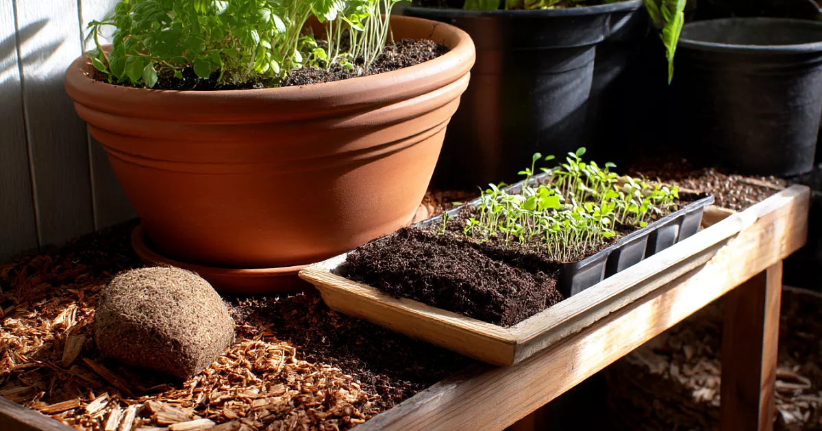 Почву с грядки в горшки брать не стоит: в контейнере она уплотняется и ведёт себя непредсказуемо. Грунты для горшков делают специально лёгкими, воздухопроницаемыми, но при этом влагоёмкими и дренирующими. В составе могут быть компостированная кора, зелёный компост, кокосовое волокно, песок или грит, перлит, вермикулит и иногда добавленные удобрения. Для рассады обычно берут более «бедную» смесь, а для взрослых растений — более питательную универсальную. Если универсальный грунт крупноват, его можно просеять для посева.