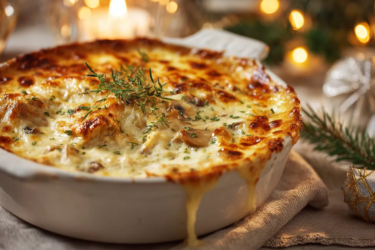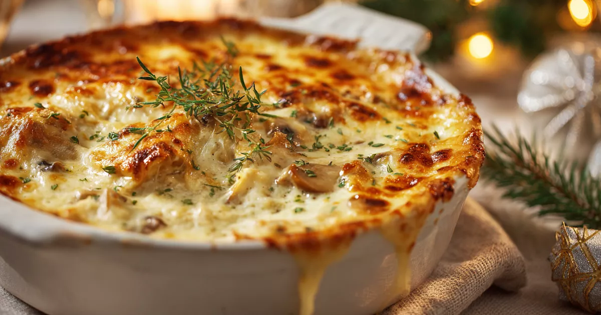 Классическая горячая закуска — нежная курица, ароматные грибы и сливочный соус под золотистой корочкой сыра.